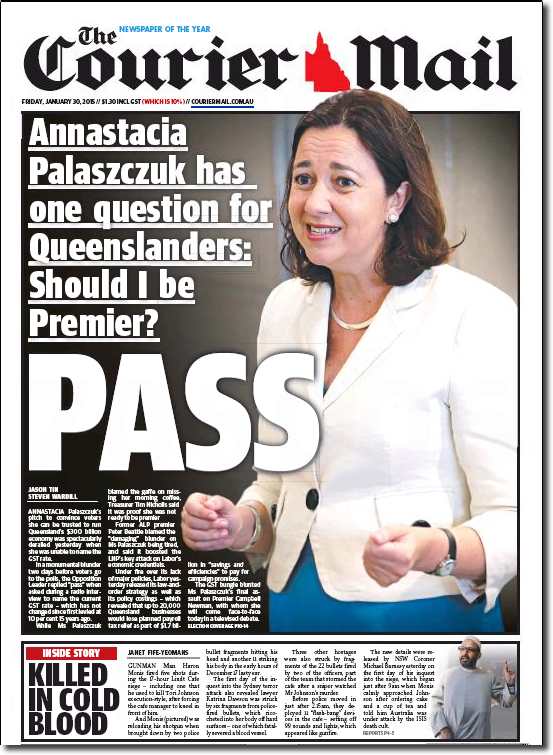 The final verdict. The Courier-Mail passes on Palaszczuk (note their little comment on the level of GST next to the price).