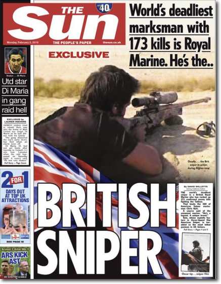 Compensating for something? Christ, now it’s sniper-chic. In the wake of American Sniper, here’s the front page of today’s The Sun in the UK: