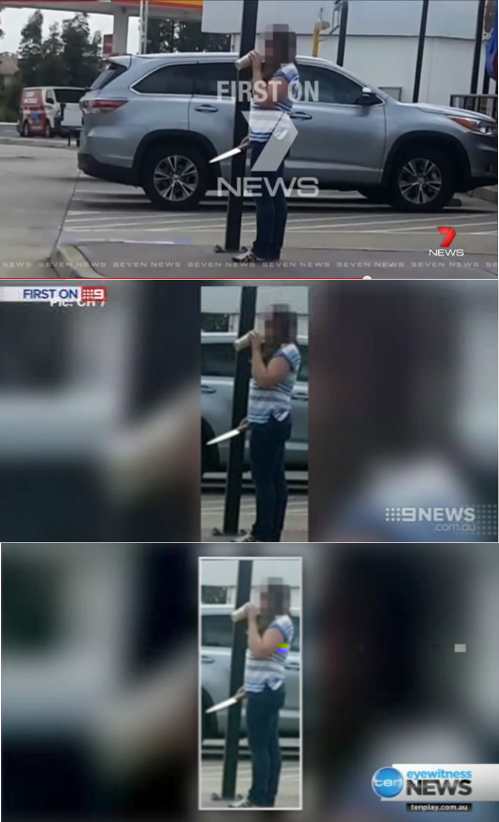 First on … where? When a woman was shot by police after reportedly threatening them with a knife in West Hoxton in Sydney’s south-west yesterday, Channel Seven sprung into action, and managed to secure a photo of the woman outside the Hungry Jack’s outlet holding said knife.