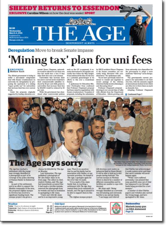 Alam’s legal representation Slater and Gordon said it was part of the settlement Fairfax reached with the family, which also included a $20,000 donation to help build a new Afghan mosque in Doveton, and an undisclosed amount in damages directly to Alam. Slater and Gordon also says Age editor-in-chief Andrew Holden has written a letter to the Acting Chief Commissioner of the Victorian police force about the incident, given Alam wants to become a police officer. Another letter was also sent to the Afghan community apologising for the mistake.