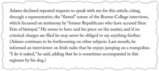 No comment, no problem. The New Yorker has published a 16,000-word investigation on whether Sinn Fein president Gerry Adams authorised IRA killings. Adams wouldn’t talk to the reporter. Here’s one way to take a “no comment”.
