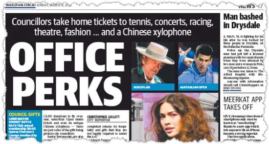 “Cash donations to fly overseas, semi-final Open tennis tickets and even an antique Chinese xylophone — these are just some of the gifts being given to city councillors.”