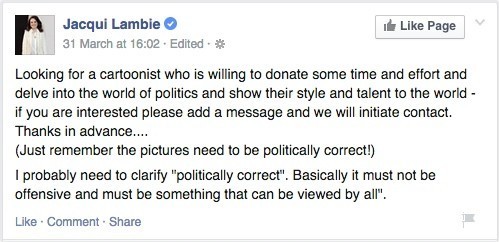 Work for Lambie? Don’t say there’s no jobs in journalism … Jacqui Lambie is hiring a cartoonist.