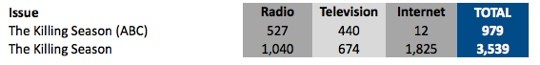 The Killing Season was a genuine news event as opposed to a satire of news coverage, and so it makes sense that the ABC would mention it often in its news coverage. But 979 mentions over two weeks does seem a little much. Of course, the commercial TV networks do this kind of thing all the time. — Myriam Robin