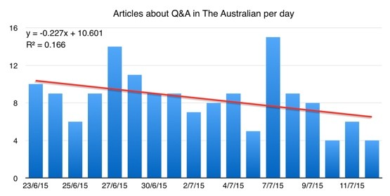 Of course, in the four weeks since the Zaky Mallah kerfuffle started, The Australian has been leading the charge. Data whiz Rupert Hanson tried to figure out how long until the Oz stops running Q&A-themed pieces, based on the trend up to yesterday. The answer: in about eight weeks.