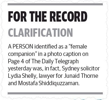Blanks yesterday contacted The Daily Telegraph with a statement of concerns, requesting an apology and correction. Blanks told Crikey this morning that the paper denied that what it had printed was defamatory. The News Corp tabloid has not agreed to apologise, but did run a clarification in its “For the Record” section, acknowledging Shelly was acting as a lawyer for the men. The clarification is printed on page 53 of The Daily Telegraph this morning …