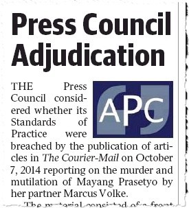 Courier-Mail in breach. The Press Council has found The Courier-Mail in breach of its standards after the paper published its infamous “Monster Chef and the She-Male” front page about the murder of transgender woman Mayang Prasetyo. In an adjudication carried on page 2 of today’s Courier-Mail, the paper is found in breach for the prominent treatment given to Prasetyo’s gender, and the paper’s focus on her occupation.