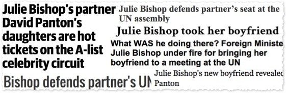 Bishop’s companion. Since Julie Bishop started stepping out in public with Melbourne property developer David Panton last year, the media has oscillated between the formal “partner” and “boyfriend” to describe him. After he was snapped sitting next to Bishop at the UN yesterday, today’s media coverage has him in the limelight once again. News Corp and AAP have tended to stick to “partner”, while at Fairfax and outlets like the Daily Mail, “boyfriend” has been the go …