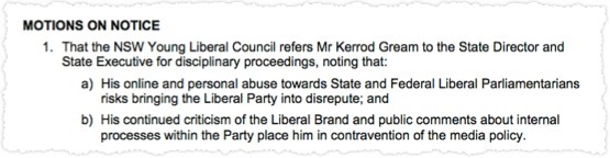 Crikey has spoken to numerous Young Liberal members in Sydney and elsewhere who have slammed the NSW division’s increasing control over the way its members interact on social media. Their resentment has most recently focused on a motion on the agenda for the next NSW Young Liberal Council, which calls on the Young Liberal executive to refer university student Kerrod Gream to the state executive for disciplinary action after comments he made on Facebook. Supporters of Gream have told Crikey his main crime was to robustly criticise the state government’s lock-out laws. The motion proposed puts things somewhat differently — it refers to his “online and personal abuse towards state and federal Liberal party parliamentarians” and criticisms of “the Liberal brand” and “internal party processes” as bringing the party into disrepute, thus putting him in contravention of the New South Wales media policy that covers party members.