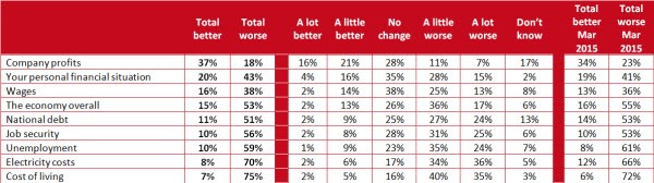 Despite new Prime Minister Malcolm Turnbull’s message of excitement and opportunity, voters are still overwhelmingly pessimistic about the economy, with 75% saying the cost of living is worse than it was 12 months ago. Some 53% of voters believe the economy overall is worse than a year ago and more than half believe national debt, job security and unemployment have all got worse. These results are similar to when voters were asked about the economy in March.