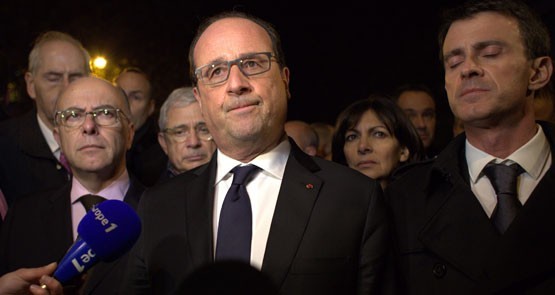 French Interior Minister Bernard Cazeneuve, President Francois Hollande and Prime Minister Manuel Valls speak to media after the attacks