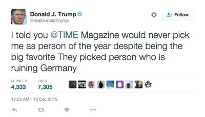 Not this Time. Donald Trump spat the dummy overnight when he failed to made Time magazine’s person of the year. Time editors awarded the gong to German Chancellor Angela Merkel. Second, gallingly for Trump, was Islamic State leader Abu Bakr al-Baghdadi. Trump was third.