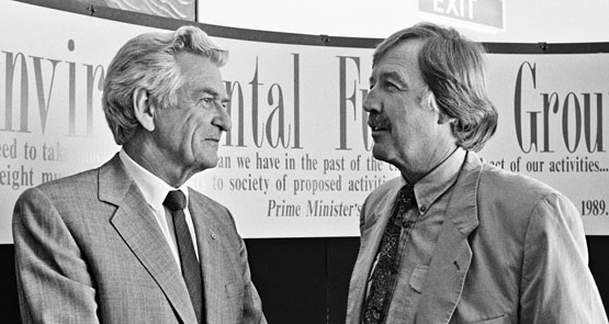 Bob Hawke and journalist George Negus at the launch of the Environmental Futures Group, 1991