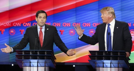 Still, the message got through. On Thursday night’s debate, Marco Rubio came out swinging against Trump, and landed a couple of blows before the event descended into utter farce. Rubio went Trump for hiring illegal workers to build his buildings –Trump: “You’ve hired nobody”, big cheers — and for the flim-flam “Trump University”, which ran in the 2000s selling gimcrack real-estate courses, and folded in acrimony and lawsuits.