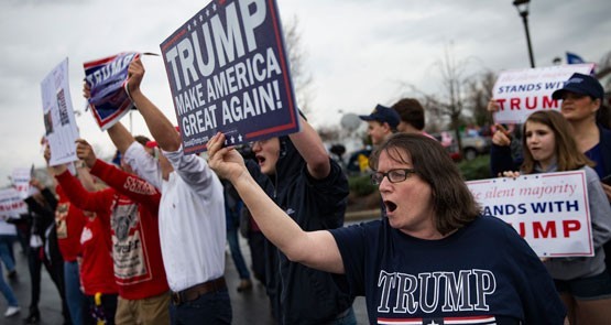 The US presidential primaries campaign moved into new gear over the weekend as mass protests began at Donald Trump rallies, with protesters being pepper-sprayed in Kansas City, and the abandonment of a rally in Chicago by order of Trump himself. On Saturday, a protester charged the stage and Trump squealed like a small kid, before being surrounded by secret service agents.