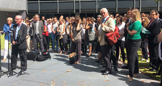 At about 3pm today, Fairfax Media’s Sydney staff met on the front lawn outside company headquarters in Pyrmont. The meeting was fronted by house committee representatives Anne Davies and Marcus Strom, both senior journalists, and also Media, Entertainment and Arts Alliance CEO Paul Murphy.