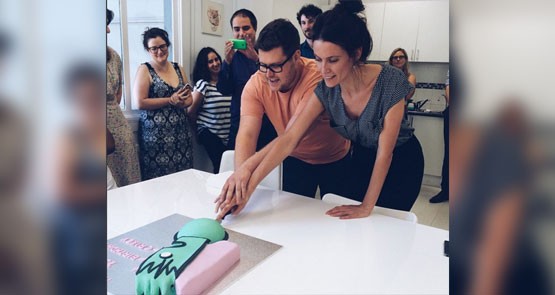 Former editor Jason Whittaker and current editor Marni Cordell cut Crikey’s 15th birthday cake