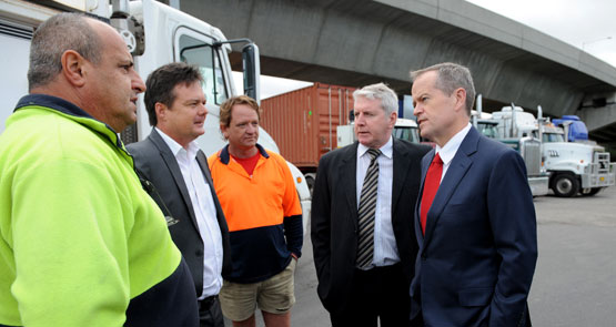 Opposition Leader Bill Shorten and Labor’s Employment Spokesperson Brendan O’Connor speak to truckies about the RSRT