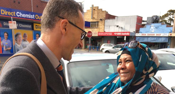 “G’day, Richard Di Natale.” “Oh, I’m voting for you.” “Well, for Alex.” “Yeah.” “What do you do?” “Well I’m in medical technologies.” “Oh right, you know, I’m a doctor — where did you study?” “Monash.” “Right that’s- ”