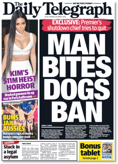 We couldn’t go past The Daily Telegraph today for both the revelations that the head of Mike Baird’s greyhound racing transition taskforce tried to quit because he opposed the ban on dishlickers, and for the excellent pun.