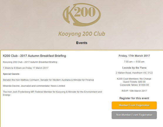 Climate denier to raise funds for Environment Minister. A tipster has shared with us the invite to the Kooyong 200 Club’s next event, featuring none other than News Corp columnist Miranda Devine as a special guest alongside Finance Minister Mathias Cormann and member for Kooyong himself, Josh Frydenberg. The club, like the Higgins 200 Club and Menzies 200 Club, exists to raise funds for the local Liberal MP. Our tipster thought it was interesting that the Environment and Energy Minister was inviting along a climate change denier as a speaker.
