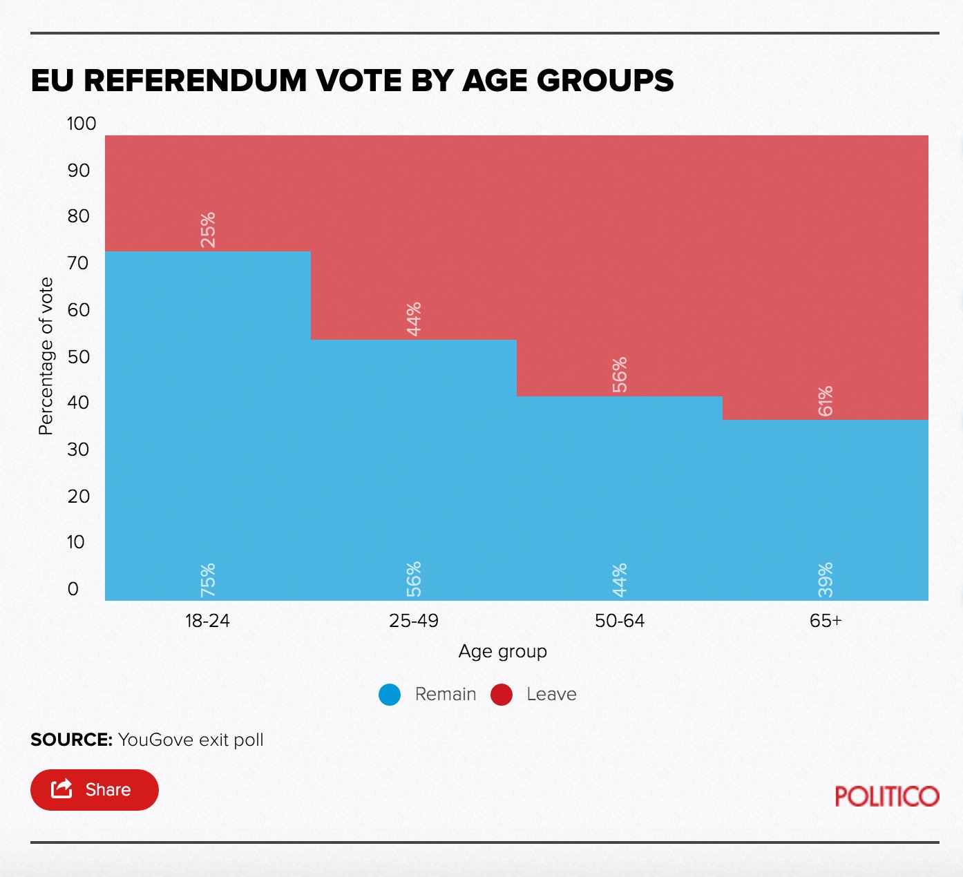 Then came the still more polarising experience of the Brexit referendum last June, which by one account elicited a 75-25 split in favour of remain among those aged 18 to 24 who made the effort to vote, compared with 61-39 for leave among the greatly more active 65-plus cohort.