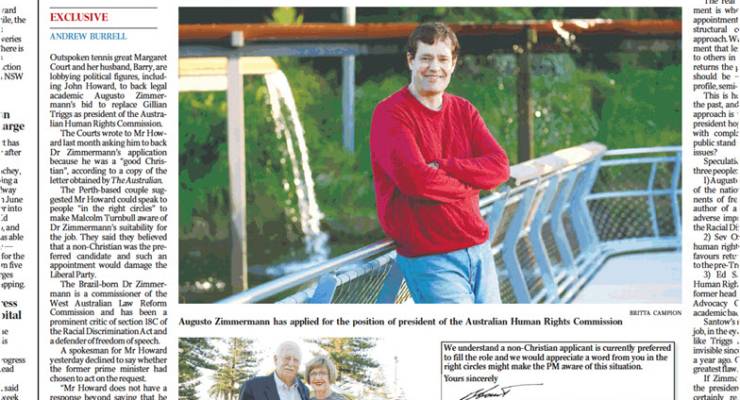 A few days before the storm that engulfed her last month — over comments opposing marriage equality and calling trans kids “the work of the devil”– former tennis great Margaret Court and her husband Barry (a former president of the Western Australian Liberal Party) were attempting to lobby politicians to back their pick for Gillian Triggs’ replacement as president of the Australian Human Rights Commission. According to a report in Tuesday’s Australian, a letter to former prime minister John Howard suggested he should also support Augusto Zimmerman. He is a WA based, Brazilian born legal academic and a member of the Victory Life Church in which Court is a pastor. “He is a good Christian” the letter told Howard.
