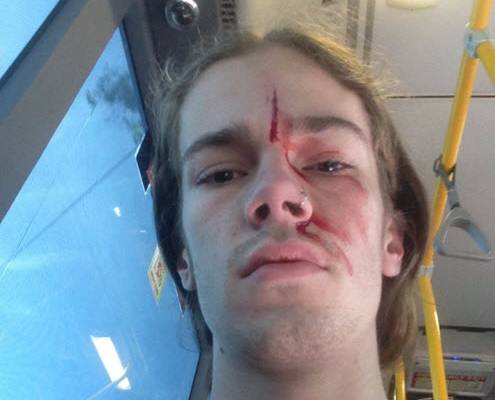 Another former prime minister, Kevin Rudd, tweets a picture of his 19-year-0ld godson, Sean Foster, with a lipstick-red gash splitting his forehead, smearing down past his eyes onto his cheek. Foster had been punched in the face after calling a man he saw tearing down rainbow posters in east Brisbane a homophobe.