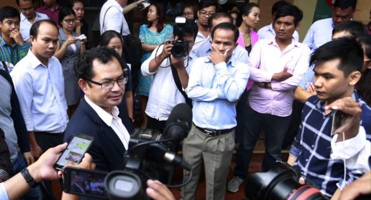 Kay Kimsong, left, editor-in-chief of the Phnom Penh Post, speaks to reporters after being fired by the newspaper’s new owner for a report it published Monday.