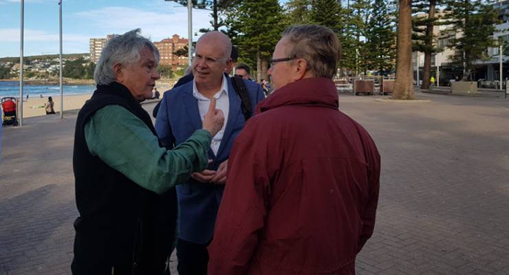 I rush directly from Tony Abbott’s mall meet and greet with John Howard to meet Dean Harris, Labor’s candidate for Warringah. He, along with the Greens’ Kristyn Glanville and independent Zali Steggall, are there on the Corso, addressing the local chapter of Friends of the ABC, who are arranged in a little grey horseshoe. (Even by the standards of a Warringah protest, this is a mature crowd.)