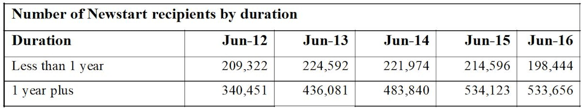 The table below shows that in June 2016, 73% of Newstart recipients were classified as long-term (one year or more), up from 71% the previous June.