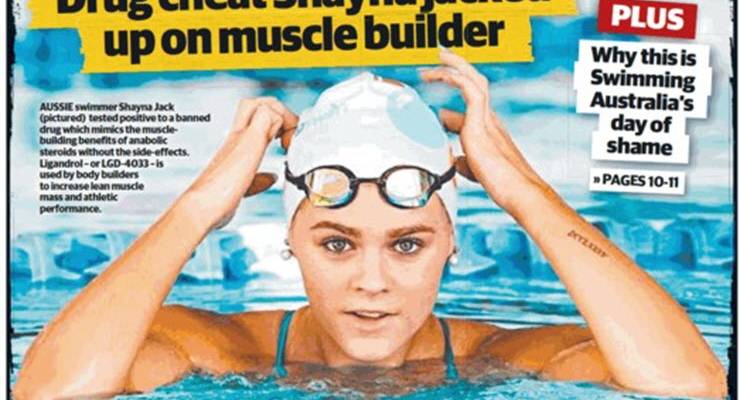 Yesterday’s Courier-Mail went the exact opposite route, highlighting Jack’s defense claim. The Sydney Morning Herald and The Australian went for a slightly softer version of each, with the former offering Jack looking pensive and “baffled” over the incident, and the latter publishing an explainer on “the muscle drug that sunk Aussie swim star”.