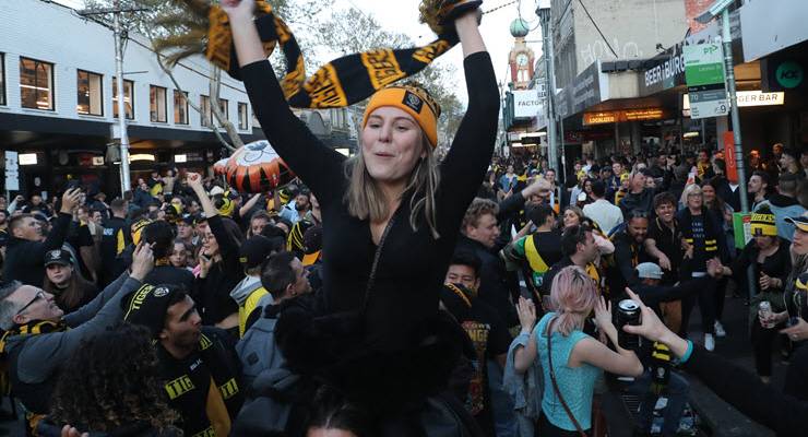 There are young families, old die-hards, men in suits and others in guernseys christened by black Sharpies. They’re spilling out of the dive bars and reno’d gastropubs and cheap sushi joints and Instagrammable restaurants that charge $4 for still water — most with a beer in hand despite cops’ orders. The Herald Sun asked a dad with kids, aged 13 and 15, what he was doing after Richmond’s historic 89-point win over the league’s youngest club, the GWS Giants. “I’m not entirely sure where we will end up,” he said, “but I just want to sing”.