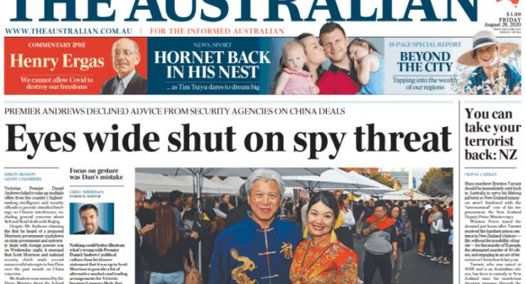 The Australian followed up its Friday front page (“Eyes Wide shut on spy threat: Premier Andrews declined advice from security agencies on China deal”) with a Saturday front page exclusive from its recent hire, Walkley Award-winning investigations writer Sharri Markson: “Chinese military links inside uni”.
