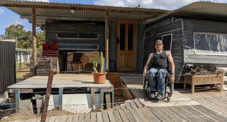 A homemade wooden ramp running alongside a barbed-wire fence leads to the two caravans Jay White calls home. It’s not an ideal living situation for anyone, let alone for someone in a wheelchair.