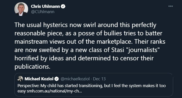 Traditionalists responded — as they have all year — with the cancel culture card. Nine’s Chris Uhlmann pumped up the rhetoric-o-matic with “usual hysterics”, “a posse of bullies” and “Stasi ‘journalists’ ”.