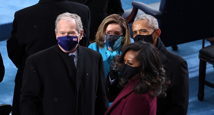 Hosting honours go to US senator and former presidential hopeful Amy Klobuchar — an apparent thank you for pulling out of the Democratic primaries along with fellow hopeful Pete Buttigieg (future transport secretary). Buttigieg is in attendance, as are Barack Obama, George W Bush and Hillary and Bill Clinton.