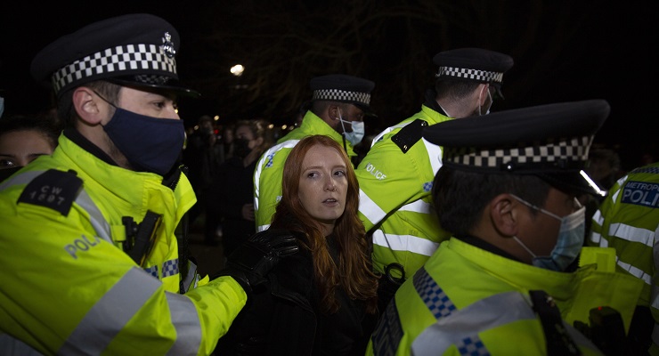 With London still in lockdown, the gathering was deemed “unlawful” and the heavy-handed police presence and confronting images of women being forcibly arrested led some to point out the obvious irony. Here was a quiet protest against women being dragged off the streets… where the police were dragging women off the streets.