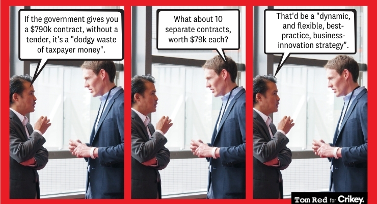 The contracts provide plenty of jobs, but the government doesn’t advertise more than half of them publicly. In 2019-20, $1.5 billion of your cash was splashed around the private sector under the table.