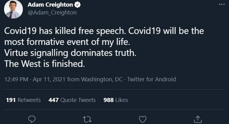 The occasion of that was of course the strangled tweet by The Australian’s Adam Creighton all the way from Washington: “Covid19 has killed free speech” tweeted the foreign correspondent of a national platform.