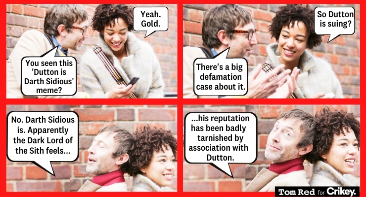 (There was a fourth defamation excitement — Peter Dutton commenced his campaign to defamation-threaten the entirety of Twitter into not calling him a potato anymore — but I’m too scared to talk about it.)
