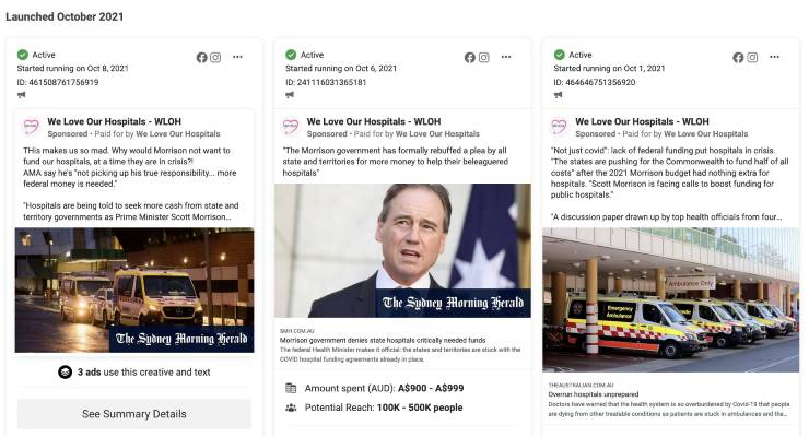 A mystery astroturfing online campaign targeting Scott Morrison’s refusal to give more funding to hospitals to deal with COVID-19 case peaks has spent more than $10,000 to advertise to more than half a million Australians.