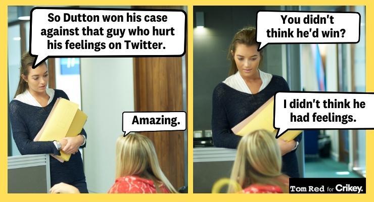 So, Dutton wins and gets the pathetically small damages award of $35,000 for what the judge found were his temporarily hurt feelings. Of actual damage to his reputation or harm to his career, there was no evidence. Dutton is at serious risk now of an adverse costs order; he’ll almost certainly end up well out of pocket. That is, for wider purposes, by the by.