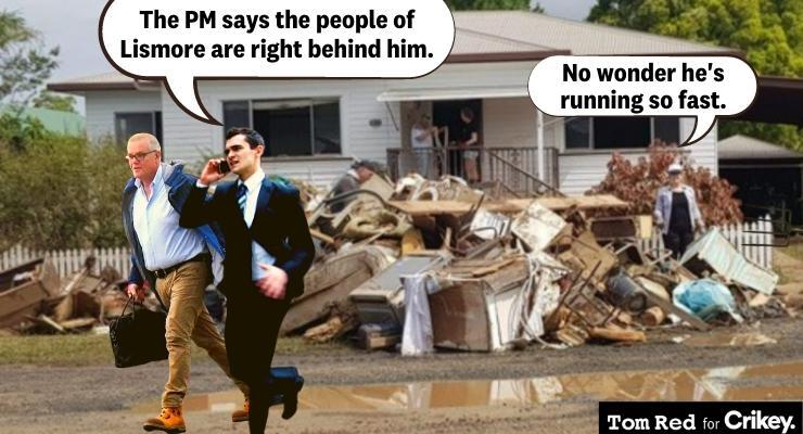 By limiting media access to his Lismore trip yesterday, Prime Minister Scott Morrison may have avoided another damning “Cobargo moment”. But the damage may have already been done. There’s widespread local anger at the perceived sluggishness of the federal response to floods — and that’s likely to hurt a government struggling in the polls.