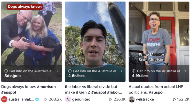 But it’s the user generated content that dominates. Hashtags like #ausvotes, #auspol, #scomo and #albo on TikTok are filled with content from ordinary users making memes, doing skits and or reacting to clips and headlines.