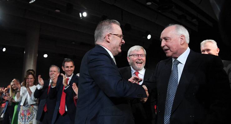 Kevin Rudd is in the front row. I’d seen him on Friday night at Curtin University, pitching his new book. You’ve never seen him happier: the smartest guy in the room, that remarkable grasp of facts, his jokes landing, a tonne of applause. It was striking seeing him in full Ruddbot mode, cycling effortlessly from Sun Tzu to stats around the car industry under his government, and reflecting that Labor is currently struggling to dislodge a PM whose appeal essentially boils down to “I would never make you read a book …”. Rudd and Paul Keating, the two former PMs in the crowd, get several shout-outs.