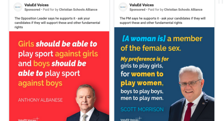 Almost half of its advertisements during the campaign so far — which have been seen by close to 900,000 Australian Facebook users — focus on trans issues. These range from opposing trans women in sport to “support[ing] women fighting for fundamental rights”.