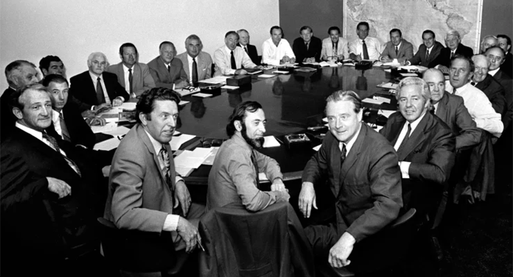 Moss pioneered community health, setting up the trade union clinic at the request of Wally Curran, and fought for a full socialised health system, rather than hybrid Medicare, with the (now battered) community health clinics the result. There he is in photos of the Whitlam ministries, the neatly coiffed, spade-bearded boho among a bunch of men who look like homicide squad detectives. After he moved to the media ministry in mid-1975, in four months — four months — he established the Australian Press Council (aimed at all media, but, eh, Murdoch, he hoped it would have more, or some, teeth), the path to SBS, and issued community radio licences, whose cultural effect would be difficult to overestimate. Much of it was done against great resistance, from within and without.