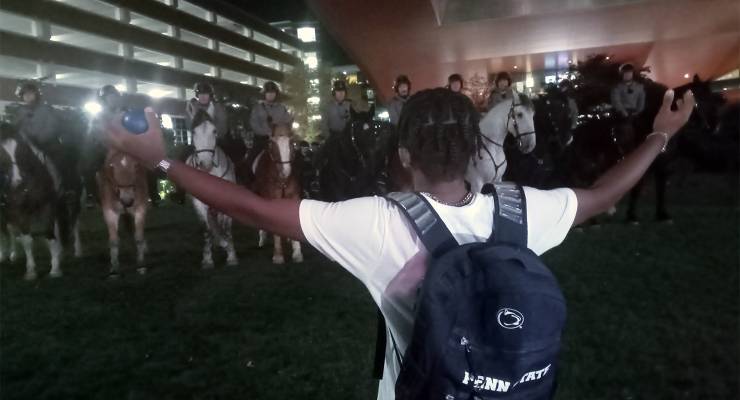 In the early dark, among floodlit red and orange autumn trees and red-brick buildings, several hundred kids swarmed the main intersection of State College, Pennsylvania — home of Pennsylvania State University, aka Penn State — the placards brandished, hoodies and jeans ubiquitous, muscle boys in T-shirts, tall, tanned, WASP-y girls in shorts, a few in Goodwill (op shop) chic.