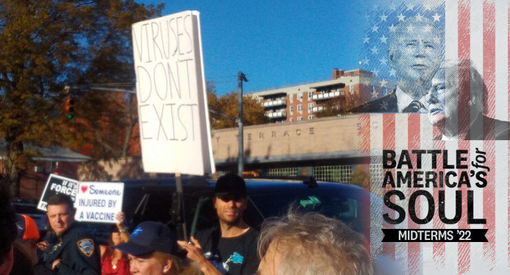 “The D in Democrat is for ‘done’! We get it done. We got the infrastructure act passed, we got the reduce inflation act passed, and we saved millions of jobs,” said Zimmerman to cheers. “Until you fired them!” the ex-teachers shot back. They were vaccine refuseniks, blaming the union for failing to defend them when a New York City vaccine mandate came in.